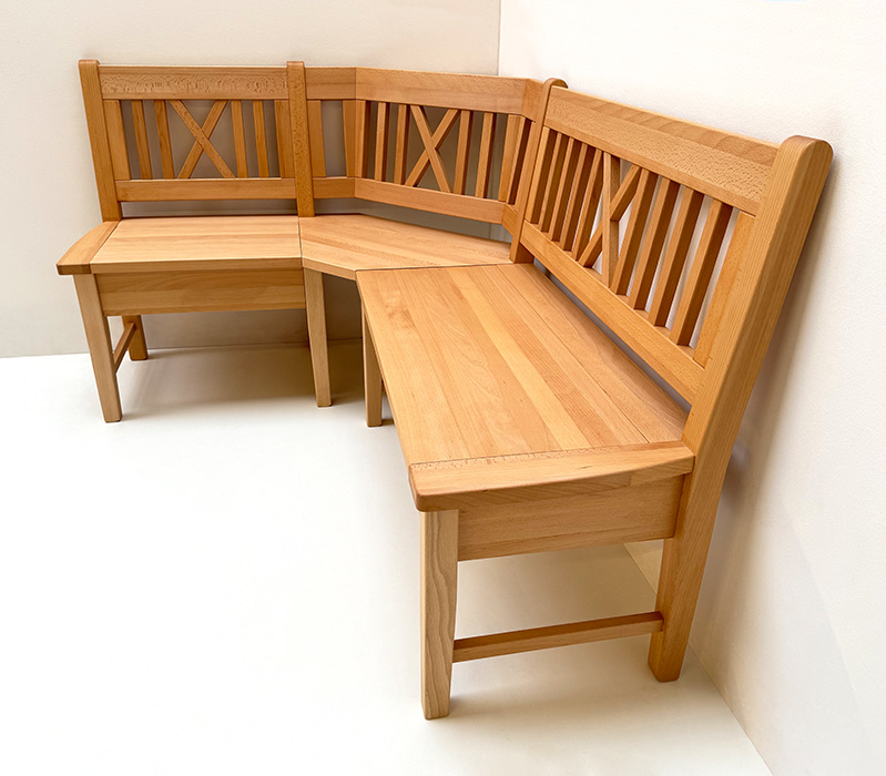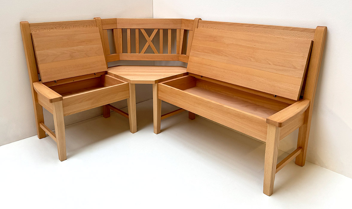Eckbank 125/165 cm, mit Truhen, Höhe 90 cm, wechselseitig stellbar, Buche massiv geölt
