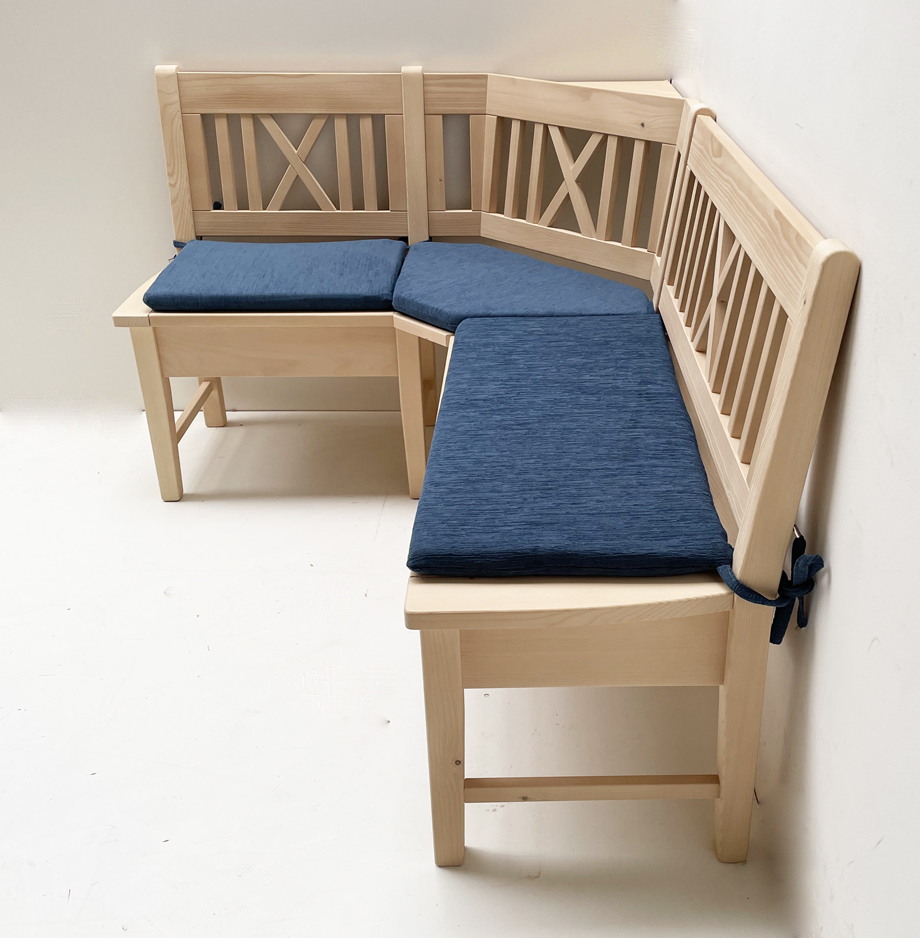 Eckbank Nürnberg Fichte 165/125 cm mit Kreuzsprossen, Rosner gewachst, Polster genäht Landshut blau
