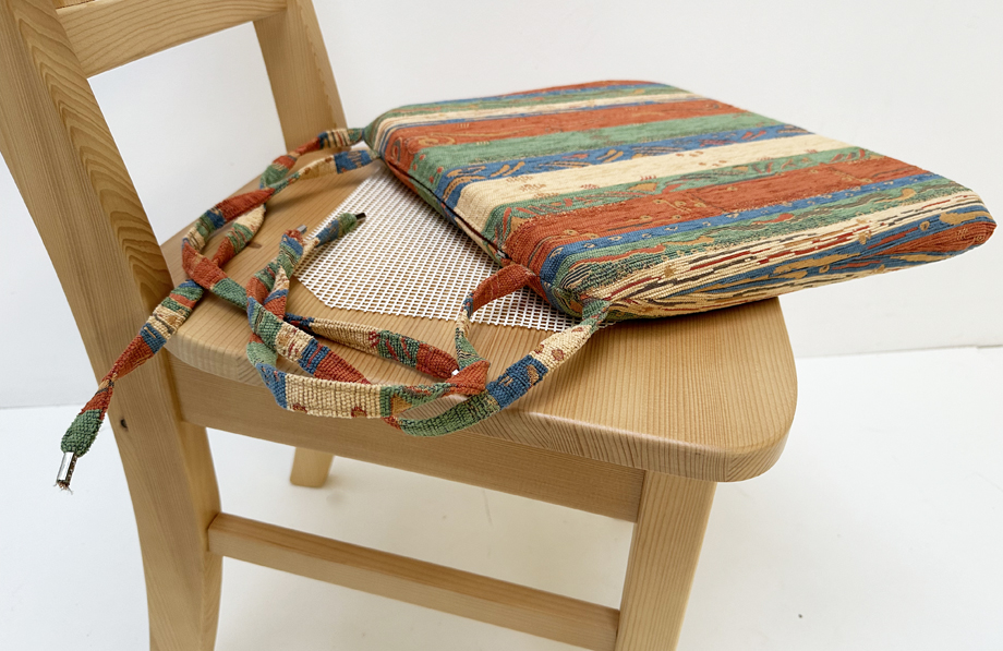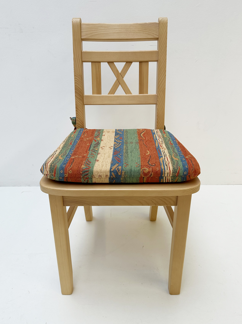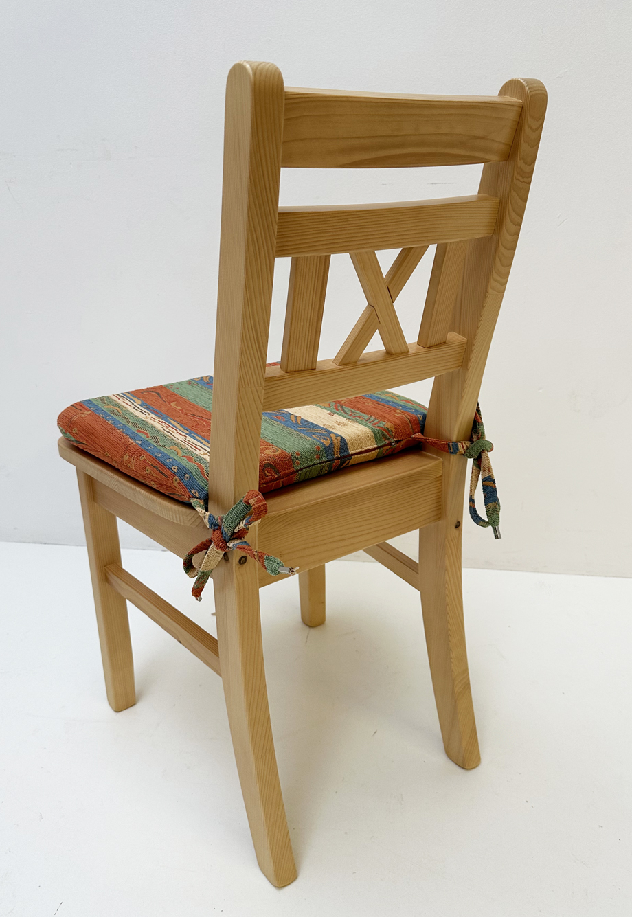 Sprossenstuhl Nürnberg mit Kreuz, Fichte massiv, Polster mit Bändern zum Anbinden, Pocking bunt