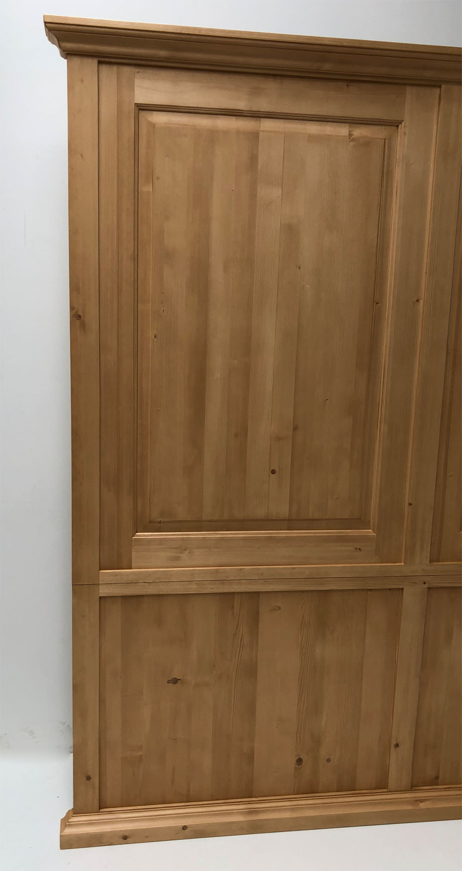 Massive Wandverkleidung nach Maß, B 200/H221 cm, inkl. Sockel, Kranz , seitlichen Abschlüßen, Ausführung massiv, mit abgeplatteten Kasetten und glatten Kasetten