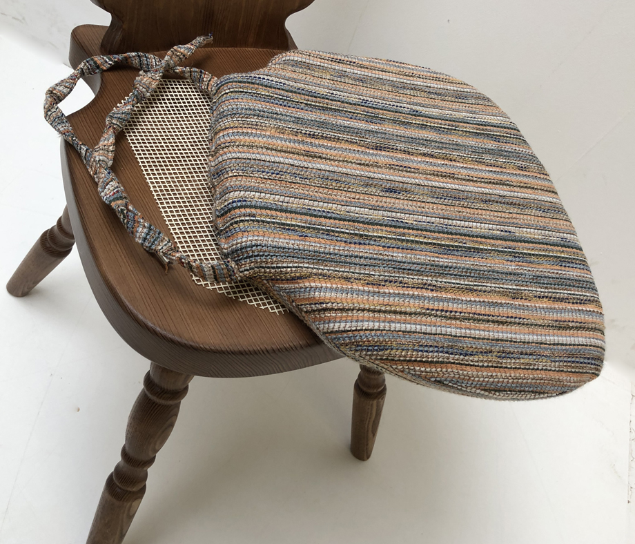 inkl. Stuhlkissen für Bauernstuhl , Ausführung lose genäht mit Reissverschluß zum Abziehen und Bänder zum Anbinden! Fest eingenähte Bänder aus dem gleichen Möbelstoff, Enden der Bänder gekrimpt ! Gegen Verrutschen mit Antirutschunterlage !