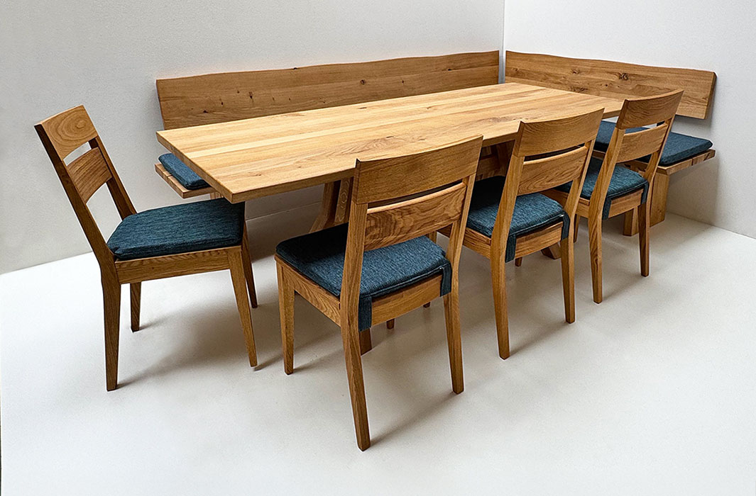 Eckbankgruppe Oviedo 250/170 cm, Tisch Larissa 90/200 cm, Baumkante, 4 Stühle, Polster Verano 672