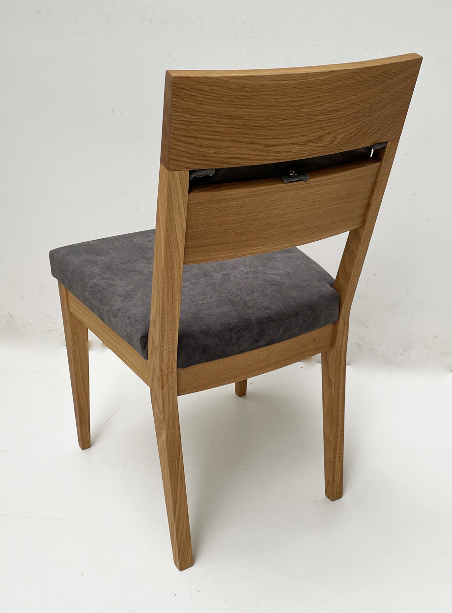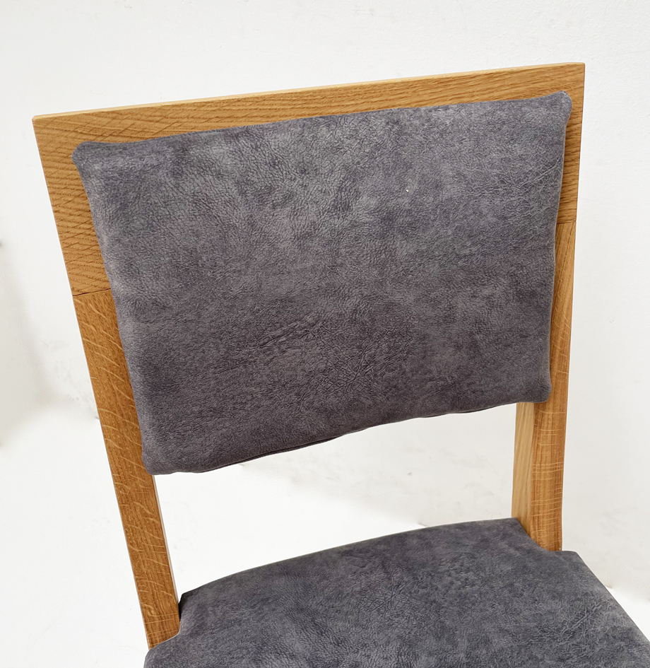 Stuhl Mod. Filippa, Sitz Vollpolster und Lehne Massivholz , Abm: , Höhe 89 cm, Sitzhöhe 45, Breite 46 cm, Tiefe 54 cm, Holz: Wildeiche, Oberfläche: geölt, Festpolster
