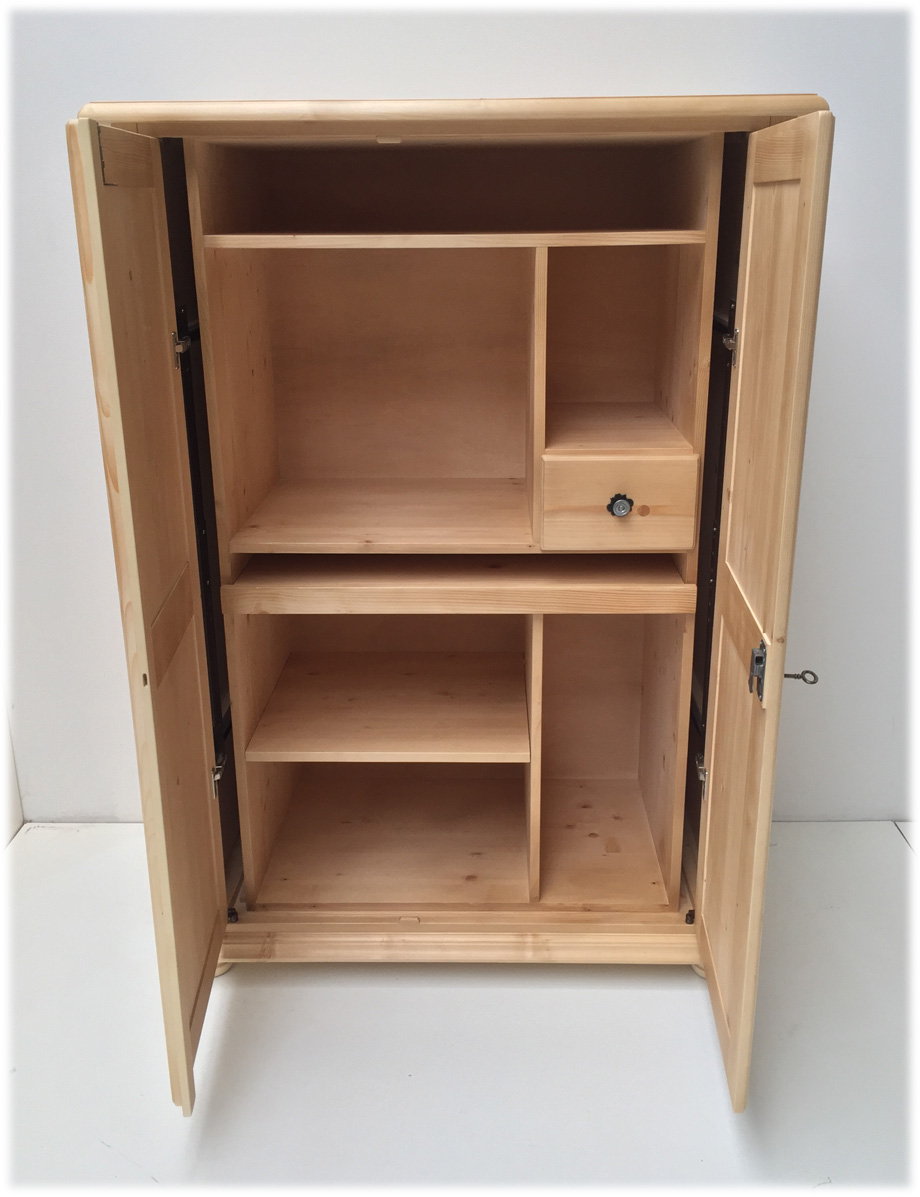 Abm. 110/156/61cm (B/H/T) , Innenmaß T56 cm, 2 Einschubtüren , Auszugsboden, Fächer für PC, Bildschirm, Drucker, Papier, CD/DVD, Fichte massiv, Farbton Rosner gewachst
