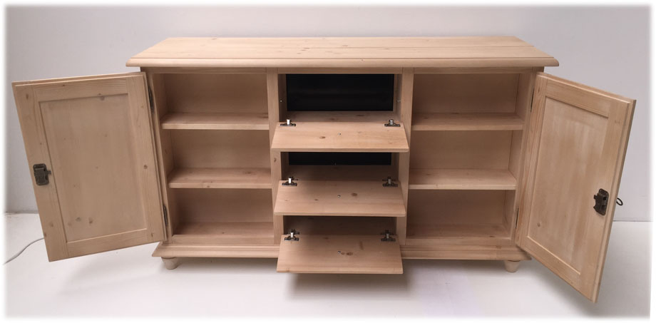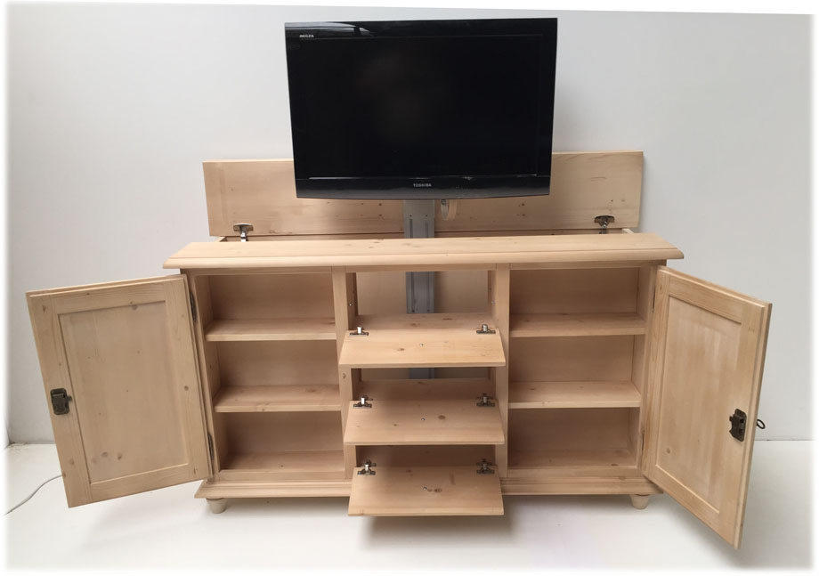 für Flat TV 30-42 Zoll, 2 Türen 3 Schubladenfronten aufklappbar, Stauraum für CD DVD, 1 Flat TV Antrieb, Abm. 150/87/47 cm (B/H/T), Fichte massiv, Rosner gewachst