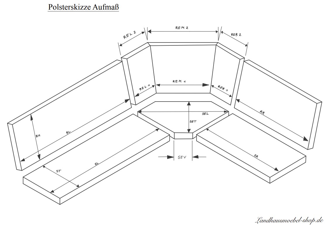 Polstersatz für Eckbanksitze,  (1 Sitz lang 120 cm, 1 Sitz kurz 80 cm, 1 Ecksitz nach Schablone, 1 Rücken lang 120 cm, 1 Rücken kurz 80 cm, 1 Eckrücken