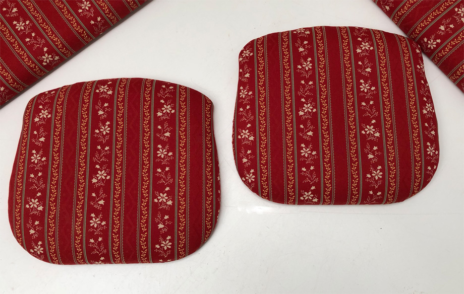 Bei uns bekommen Sie Polsterauflagen , (Schaum und Stoffe hergestellt in Deutschland), in Ausführung Polsterplatte mit (Schaum 4 cm) und Ausführung lose genäht (Schaum 4 cm) mit Reissverschlüßen , zum abziehen und waschen und Bändern an den Stühlkissen zum Anbinden !