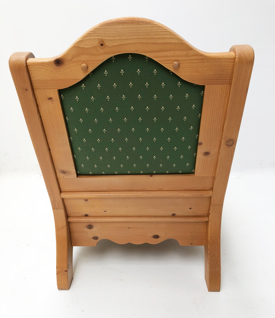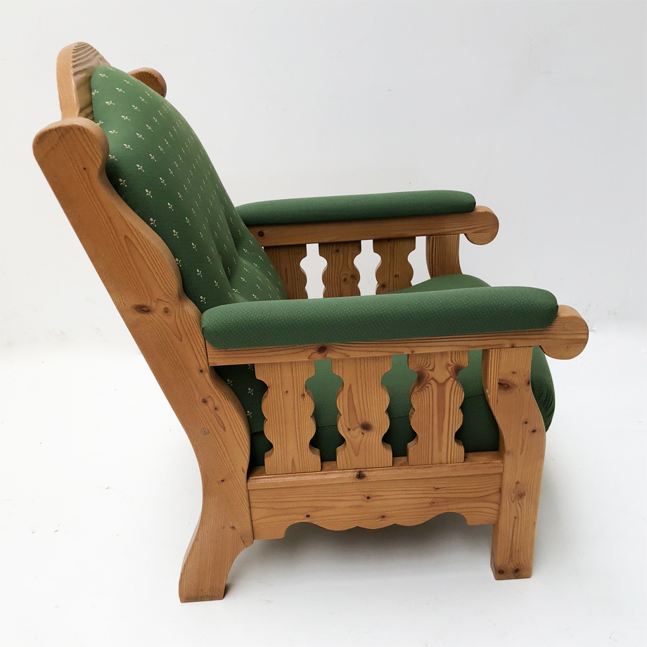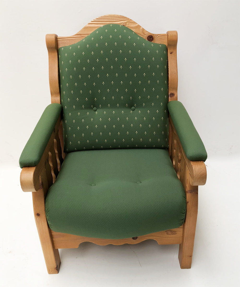 Sofa Sessel Voglauer Anno 1900, Oberfläche Waldfichte, Neupolsterung Stoff Kundl grün, Wels grün