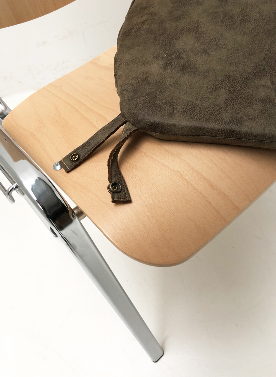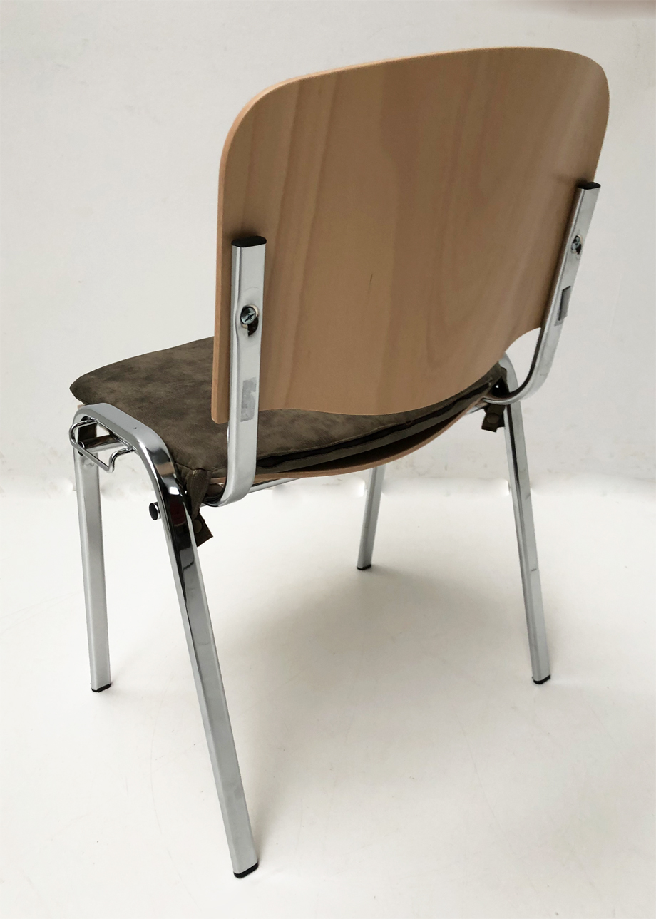 nach Kundenvorgabe für Stuhl mit Sperrholzformsitz , hergestelltes genähtes Kissen, mit Bändern zum Fixieren mittels Druckknopf.