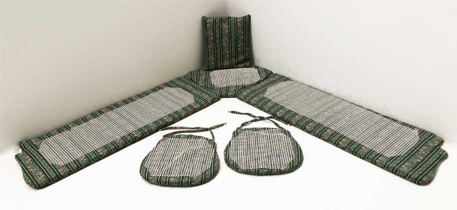 Polstersatz lose genäht für Eckbankgruppe Landau , inkl. 1 Sofa Kissen 40/40 cm gratis !! Alles in Ausführung lose genäht mit Reissverschlüßen zum Abziehen und Bänder an den Stuhlkissen zum Anbinden ! Stabile fest eingenähte Bänder aus dem gleichen Möbelstoff, Enden der Bänder gekrimpt !