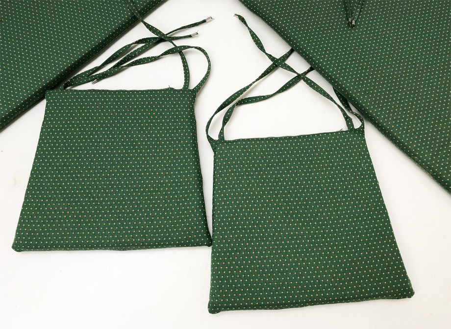 Ausführung lose genäht mit Reissverschlüßen zum Abziehen und Bänder zum Anbinden! Fest eingenähte Bänder aus dem gleichen Möbelstoff, Enden der Bänder gekrimpt ! Gegen Verrutschen mit Antirutschunterlage !