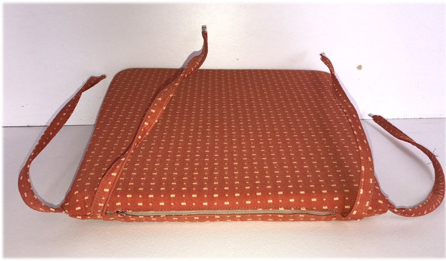 Stuhlkissen Ausführung lose genäht mit Reissverschluß  zum Abziehen und 2 Bändern links und rechts zum Anbinden am Sprossenstuhl,  Fest eingenähte Bänder aus dem gleichen Möbelstoff, Enden sauber gekrimpt, Gegen Verrutschen mit Antirutschunterlage !
