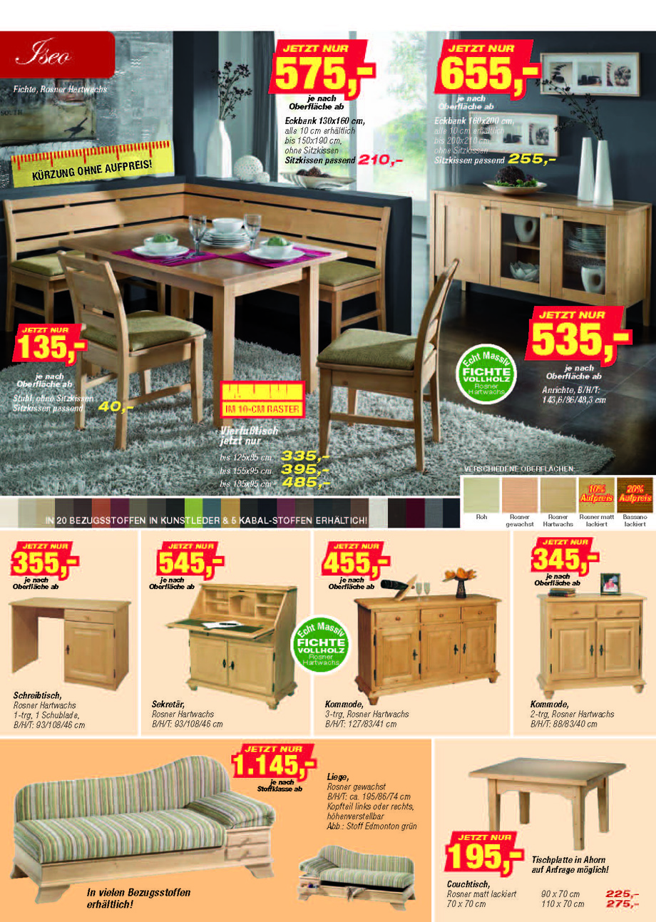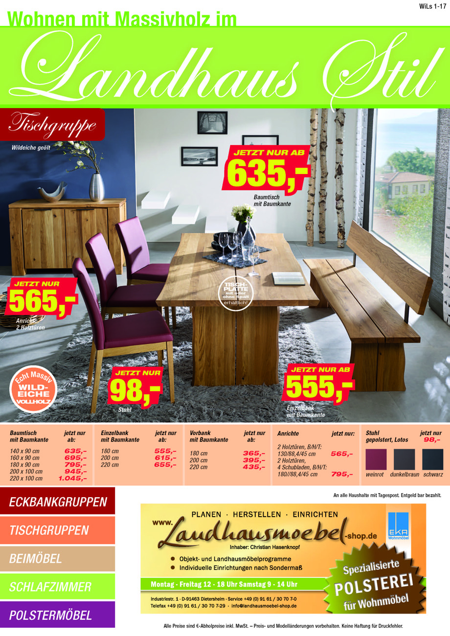Der neue Prospekt Wohnen im Landhaus Stil 1-2017 ist druckfrisch erschienen. Interessante Angebote zum Baumkantenprogramm Wildeiche gölt OVIEDO, Eckbankgruppe LARISSA in robusten Vollpolsterbezügen DUST, oder als Vollholz Bankgruppe. Modernes Massivholz Esszimmerprogramm ISEO in Wildeiche, Kernbuche, Kernesche. Tisch, Stuhl-Tischprogramm FLAVIO, ISEO in Fichte, Füssen Kastenmöbel, Liege CHIEMGAU, Landhausstuben Programm FÜSSEN, Buffets, Kleiderschränke, Schlafzimmerprogramm MERANO, in weiß lackiert, Schlafzimmerprogramm LAGO, Schlafzimmerprogramm FIRENZE und LECH Objektschlafzimmer , Zirbenprogramm DAVOS