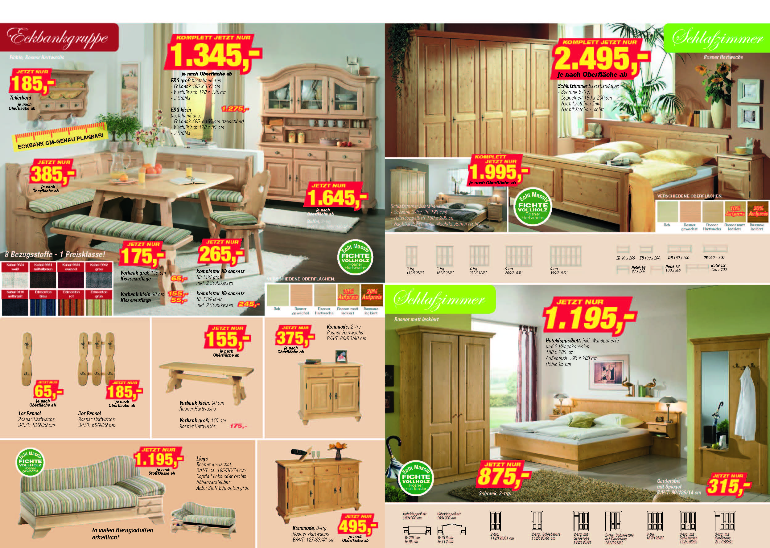 Einzelmöbel Füssen , wie Kommoden, Paneelen, sofa Liegen Chiemgau. Schlafzimmerprogramm Firenze , Fichte Hartwachs mit seinen vielen verschiedenen Kombinationsmöglichkeiten! Objektschlafzimmer TELFS, mit geschlossenem Sockel bei den Betten, Sprossen- Eckbankprogramm Linz in Buche und Eckbankprogramm Königsee in Wildeiche geölt