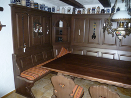 1 Eckbank im Schenkelmaß 200/350 cm, ohne Truhen, starker Sitz und starke Wangen, gerade Kasetten, Aussenwangen geschnitzt , 1 Aufsatz Wandverkleidung 100 cm mit Kasetten, mit offenem Eckkapitel, Ablage oben 12 cm tief, 1 Tisch 120/270 cm , Modell 4510 ohne Schubladen, ohne Fußrahmen, Fichteplatte 4 cm stark, Profil R20, 6 Stühle Modell WS-20, 1 Polstersatz für Eckbank und 6 Stühle, Polsterplatte , Stoff Edmonton rot, 1 Liege Chiemgau, Kopfteil Links, Stoff Edmonton rot, Alles in Fichte massiv, Farbton Rosner Torf 09 gebeizt und lackiert