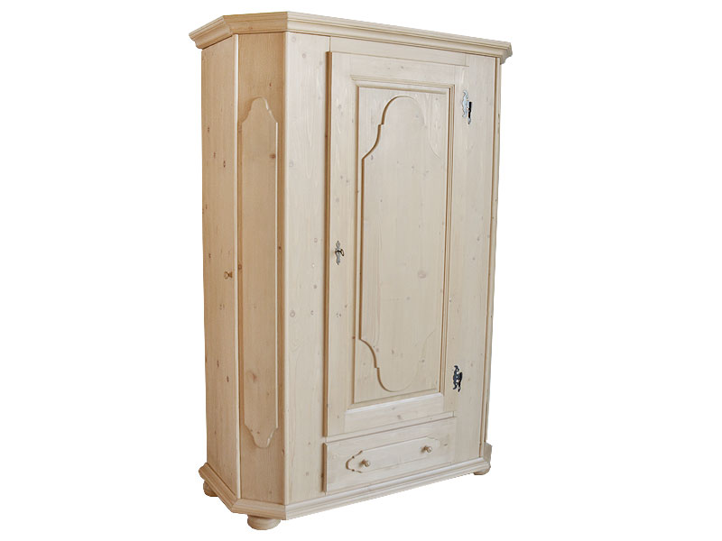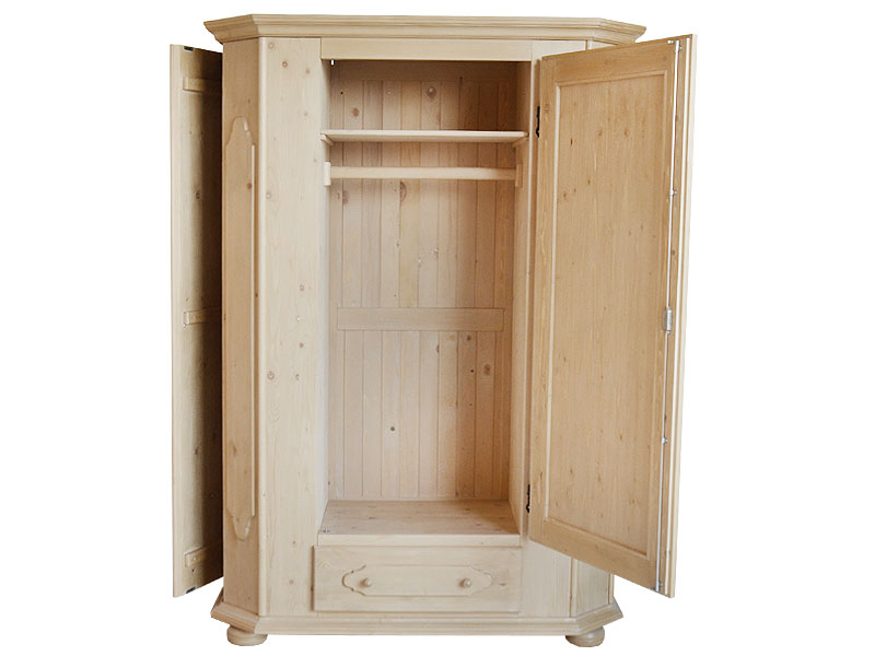 Garderobenschrank , Kleiderschrank 1.trg., 1 Schubladen, mit 2 seitlich integrierten Schuhschränken Abm. 140/200/59 cm (B/H/T), Ineneinteilung 1 Stange 65 cm Breite , 1 Boden Links und rechts seitliche Schuhschränke mit jeweils 6 Fachböden für 2 Paar Schuhe , unten Stauraum für 2 Paar Stiefel Also insgesamt Stauraum für 24 Paar Schuhe und 4 Paar Stiefel ! Fichte massiv Rosner gebeizt und gewachst ! Auch mit Spiegeltüre , oder in lackiert gegen Aufpreis erhältlich, (Programm Marigo)