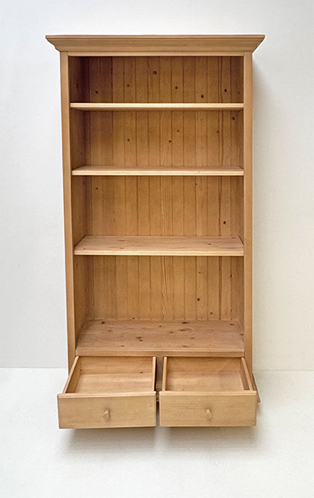 Bücherregal Füssen breit, 2 Schubladen, Holzknöpfe, Rosner gewachst