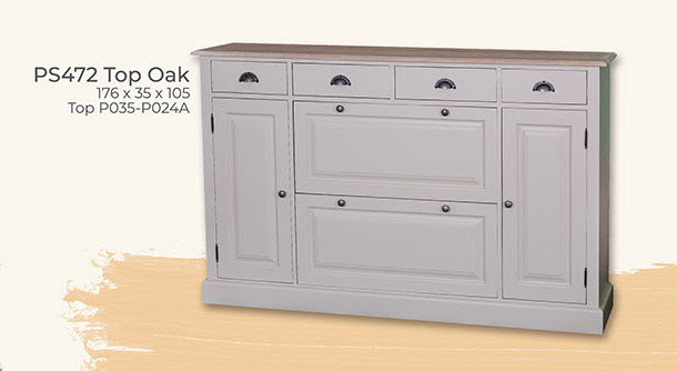 Schuhschrank Kommode, 2 Türen, 2 Klappen, 4 Schubladen, Kiefer massiv, Deckplatte Eiche massiv