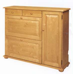 Abm. 122/105/32 cm (B/H/T) Fichte massiv, Oberfläche Rosner Hartwachs bis Schuhgr.46, 2 Schubladen 2 Klappen, 1 Türe für ca. 20 Paar Schuhe