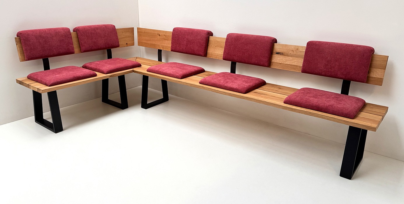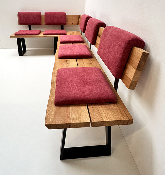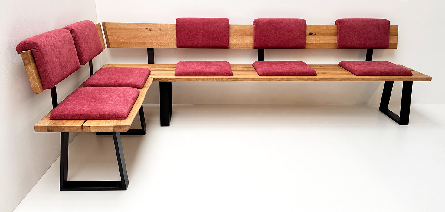 Eckbank Baumbank Oviedo, 160/300 cm, Wildeiche geölt, Einhängepolster, Schiebekissen Mercury 114 rot