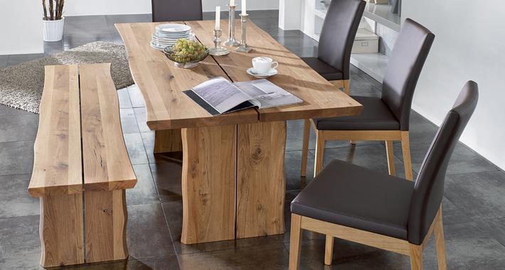 Baumtisch Mod. Oviedo, 180 x 90 cm, Platte und Gestell massiv mit Baumkante, Vorbank Mod Oviedo, 180 cm, Tiefe 44 cm, Sitz und Gestell massiv mit Baumkante, Stuhl Mod. Oviedo, Sitz und Lehne gepolstert,Holz: Wildeiche, Oberfläche: geölt, Bezug: Kunstleder Lotos 5093 dunkelbraun, Lotos 7006 schwarz, Lotos 9726 weinrot