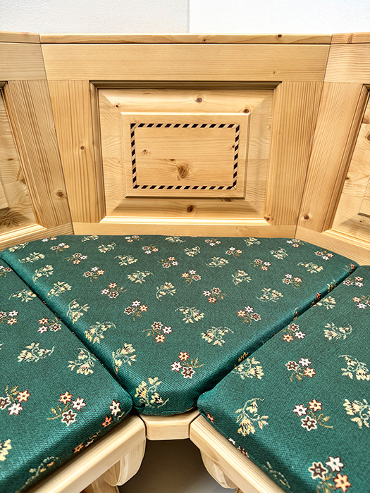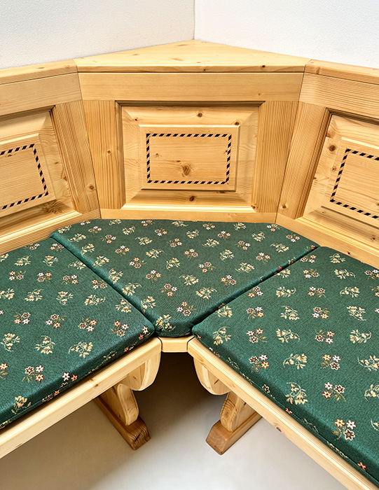 Eckbank Bozen 195/195 cm, Truhen, Kassetten Intarsien, Rosner lackiert, Polster genäht, Kössen grün