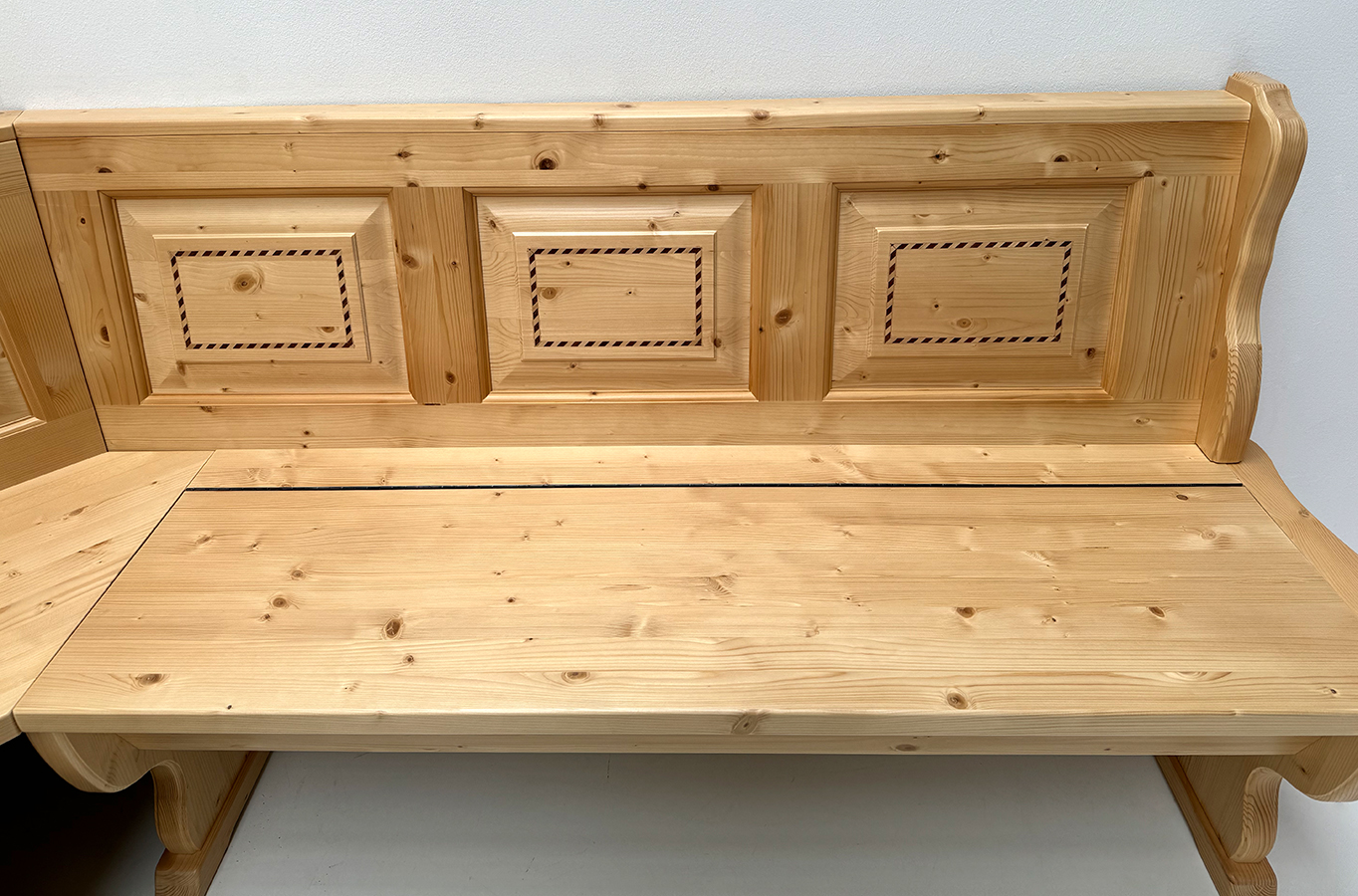Eckbank Bozen 195/195 cm mit Truhen, Kassetten mit Intarsien, Rosner lackiert