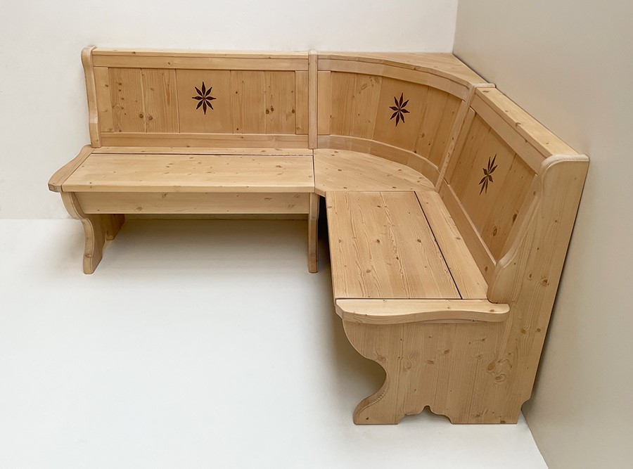 Eckbank Tirol, Sondermaß 165/140 cm, mit Truhen, Intarsien, Fichte Rosner gewachst