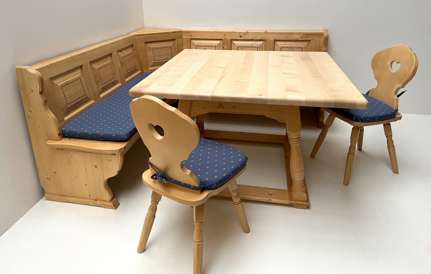 Eckbankgruppe Bozen 195/195, Kassetten Intarsien, Truhe, Tisch 1501, Ahornplatte, Polster Kundl blau
