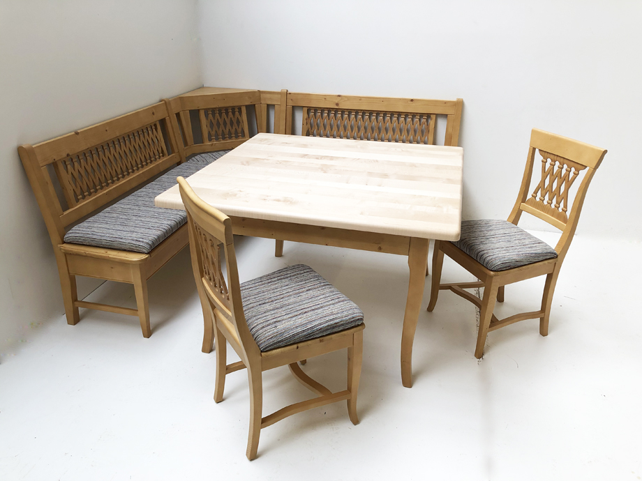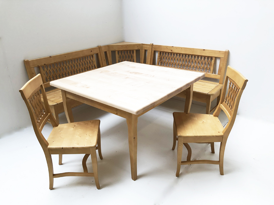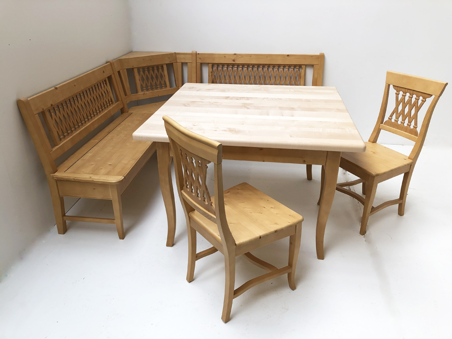 Eckbankgruppe Kramsach, Eckbank 190/190 cm, Vierfußtisch Ahornplatte 120/120 cm, 2 Stühle, Salzburg