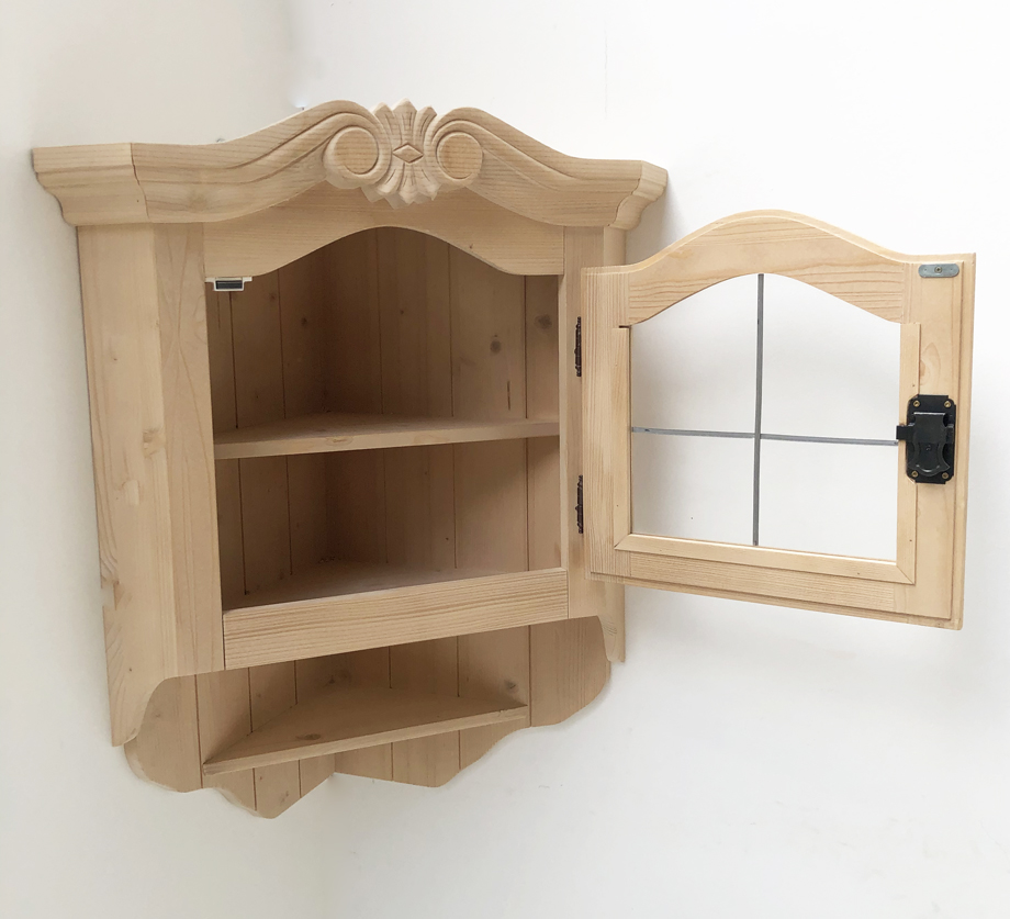 Eckhänger - Eckhängeschrank Mod. Amberg groß mit Schloß, Gas mit Bleigalssprosse, Schenkelmaß 48 cm, Höhe 90 cm, Fichte massiv, Rosner gewachst.