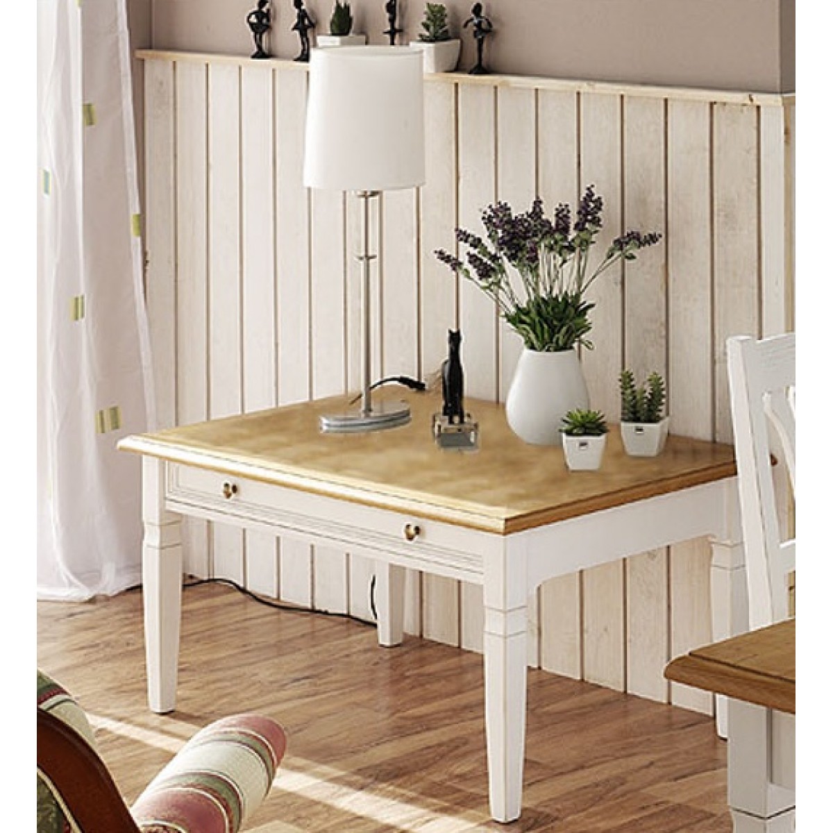 Die Abbildung zeigt den Couchtisch Victoria in Fichte massiv antikweiß mit Tischplatte in Antik lackiert.
