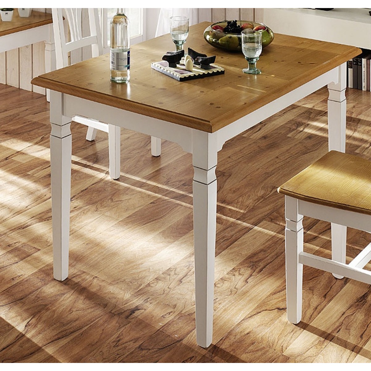 Die Abbildung zeigt den Esstisch Victoria in Fichte massiv antikweiß mit Tischplatte in Antik lackiert.