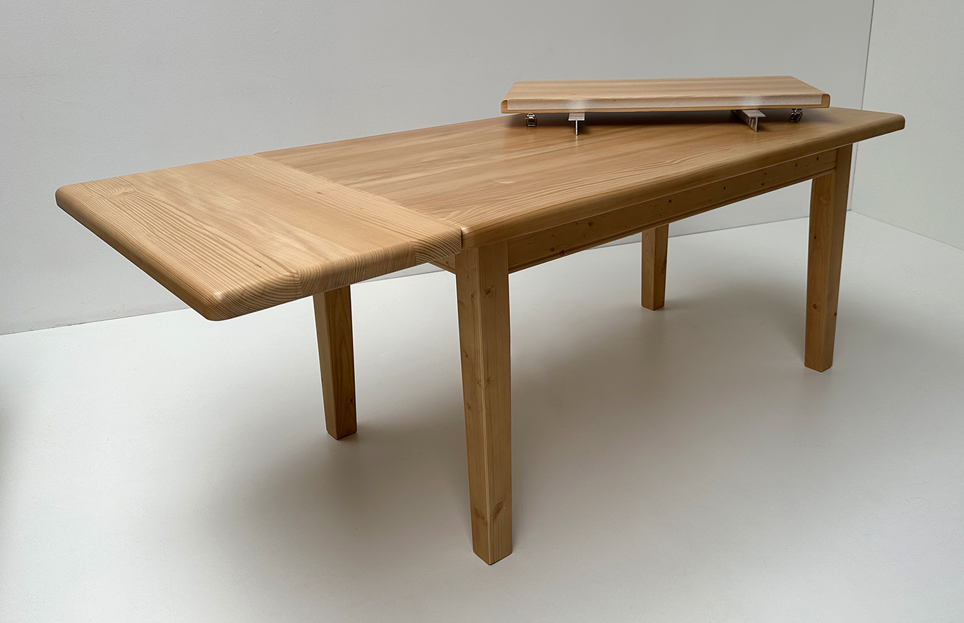 Vierfußtisch Provence 150x85 cm, Fichteplatte, 2 Ansteckplatten 40 cm, Profil R20, Rosner lackiert