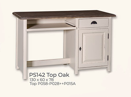 Schreibtisch, 1 Tür, 1 Schublade, Kiefer massiv, antik lackiert, Deckplatte Eiche massiv, zweifarbig