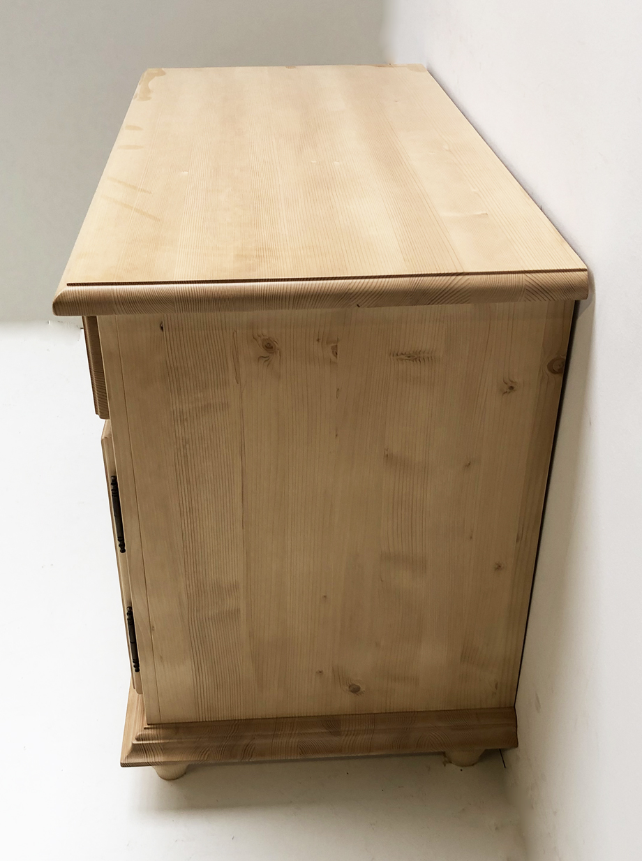 Schreibtisch Mod. Füssen, Wange mit Sockel, 108/76/45 cm (B/H/T), verfügbares Innenmaß: (Minibar) 43/52/46 cm, Fichte massiv, Oberfläche Rosner Hartwachs. Auch in roh, Rosner matt, Lugano, Bassano, Cortina und weiß lackiert möglich.