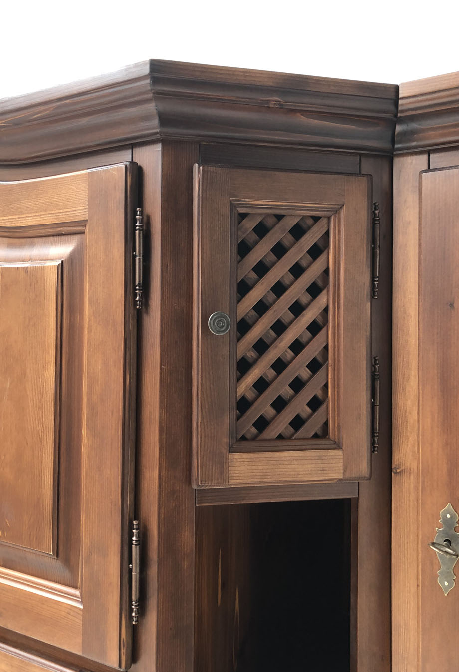 Mittelteil seitlich links und rechts: oben 1 Gittertüre, darunter 3 offene Fächer