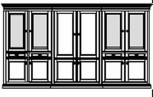 Wohnschrank 6-teilig , 8 Türen mit Holzfüllung , Mittelteil vorgezogen , 4 Türen mit Glasfüllung , 4 Laden mit Vollauszug , 9 Innenfachböden , Mittelteil Sondertiefe , L:3500 H:2140 T:460/520