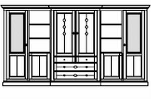 Wohnschrank 6-teilig , 2 Türen mit Holz-Glasfüllung , 4 Türen mit Holzfüllung , 4 Laden mit Vollauszug , 12 Innenfachböden , 4 Regalfachböden , Mittelteil vorgezogen , Mittelteil Sondertiefe , Türen einschiebbar , L:3590 H:2090 T:470/530