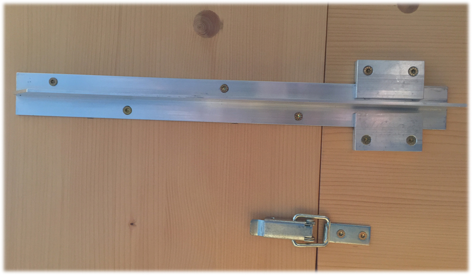 Alu- Anstecksystem zur nachträglichen Anbringung inkl. Verriegelung, Satz für 1 Ansteckplatte bestehend aus aus 2 Schienen, 4 Falzblöcken, 2 Schließhaken und Schraubensatz