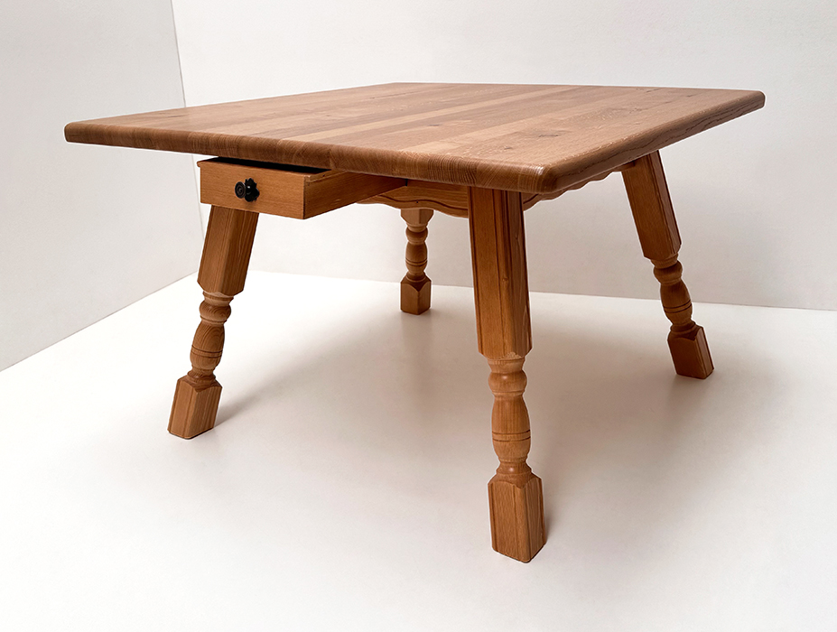 Tisch 4510 mit gedrechselten Beinen, Gestell in Fichte, Kleur 2 Antik dunkel lackiert, mit Schubladen, Abm. 115/115 cm, massive Tischplatte in Wildeiche K1 lackiert